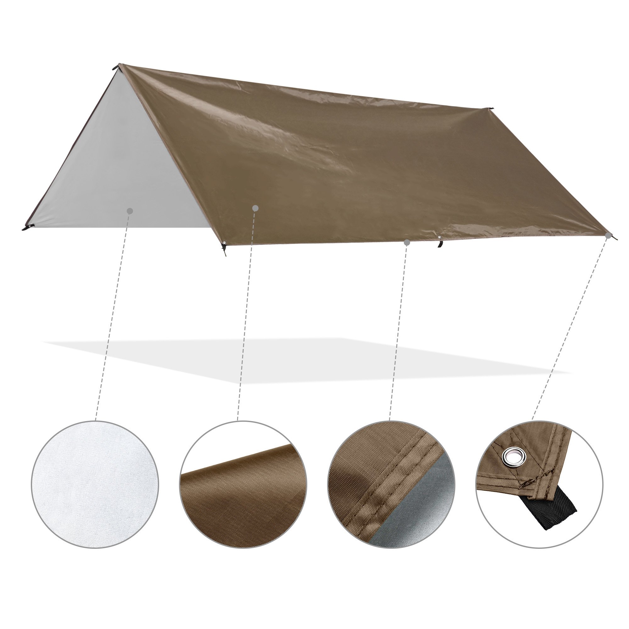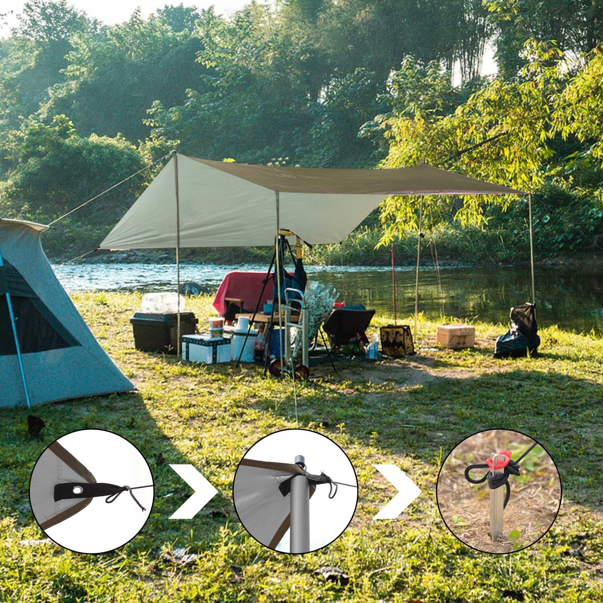 - UV Protection & Water Resistance - Made of 210D oxford fabric with silver PA coating, the tarp offers UV50+ protection for protecting you from sunlight, avoiding sunburn and reducing temperature in hot summer; shelter with PU3000mm water resistance is suitable for using on drizzling days; durable material ensures wear resistance and tear resistance for frequent use